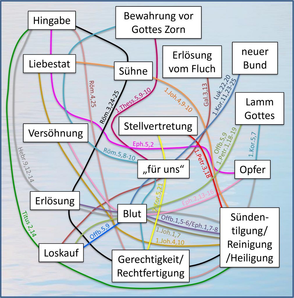 Wenn man das Neue Testament genauer analysiert fällt auf: Viele Bibelverse enthalten mehrere dieser Bilder und Begriffe gleichzeitig! Sie beziehen diese Metaphern ganz direkt aufeinander! Grafisch aufbereitet zeigt sich: Die unterschiedlichen Begriffe und Metaphern sind so engmaschig und vielfältig miteinander vernetzt, dass man sie unmöglich isoliert betrachten kann, im Gegenteil: Sie hängen alle miteinander zusammen! Sie ergänzen und erläutern sich gegenseitig.26 Der Theologe John Stott schreibt dazu: Auch wenn die Bilder teils ganz verschiedene Bildwelten von Recht und Handel heraufbeschwören, sind sie trotzdem „nicht alternative Erklärungen für das Kreuz, die uns eine Bandbreite liefern, aus der wir auswählen können, sondern sie ergänzen einander, indem jedes einen entscheidenden Teil zum Ganzen beiträgt.“ John Stott weist außerdem nach: Das stellvertretende Blutvergießen Jesu ist die gemeinsame Basis aller dieser Begriffe: „Wenn Gott in Christus nicht an unserer Stelle gestorben wäre, könnte es weder Sühnung noch Erlösung, weder Rechtfertigung noch Versöhnung geben.“ 25 (siehe auch Tabelle oben) Somit ist auch klar, dass die Lehre vom stellvertretenden Sühneopfer tatsächlich zentral ist im Neuen Testament, wie der Theologe Thomas Knöppler bestätigt: „Es ist kaum zu bestreiten, dass die Sühneaussagen eine enorme Verbreitung und in fast allen neutestamentlichen Schriften ihren Niederschlag gefunden haben.“ 27