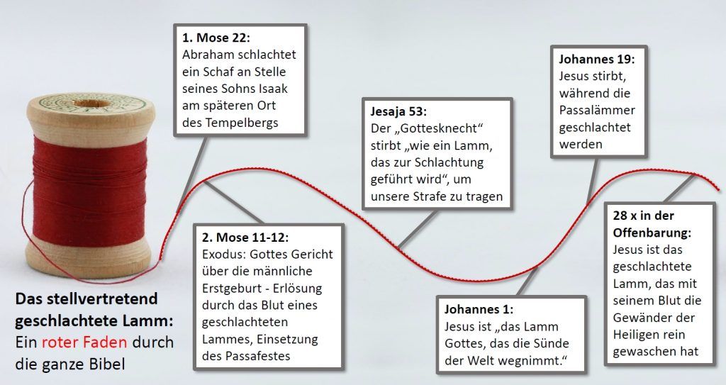 Das zeigt sich z.B. am Motiv des Lammes, das stellvertretend für Menschen stirbt. Als Abraham beinahe seinen Sohn geopfert hätte, starb ein Schaf an Isaaks Stelle (1.Mo.22,1-14). Erstaunlich: Abraham wurde extra nach „Moriah“ geschickt, dem späteren Ort des Tempelbergs, an dem der himmlische Vater tatsächlich seinen Sohn blutig sterben sah. Ist es überhaupt möglich, hier keinen Zusammenhang zu sehen?